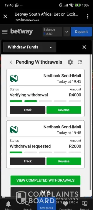 On the 24 of July 2023, I received a message from Nedbank stating that the transaction was successful, and that the money was transferred back to Betway River Trading account. Reference number: 1054009.