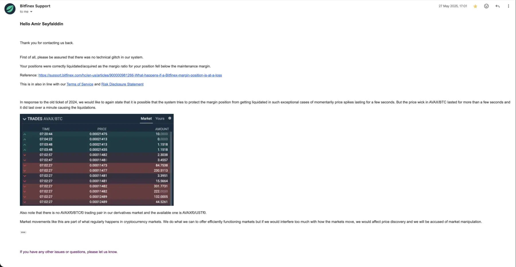 Avax/BTC margin postion liquidation that occured on 27 of May 2025 (@ 7:00 AM UTC) The case I will be presenting for your kind attention involves an irregular liquidation of a margin trade position of mine which only includes the information that has been provided to me before and after the liquidation. BEFORE THE LIQUIDATION -Due to a close call on a...
