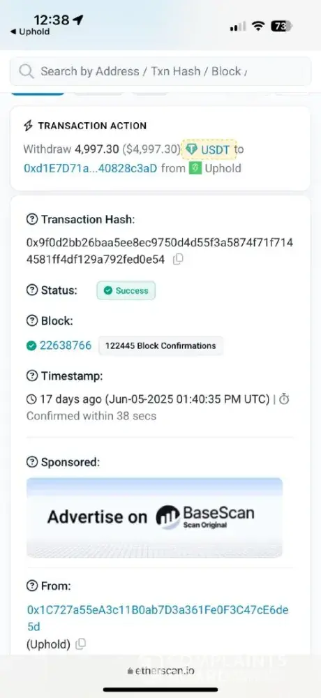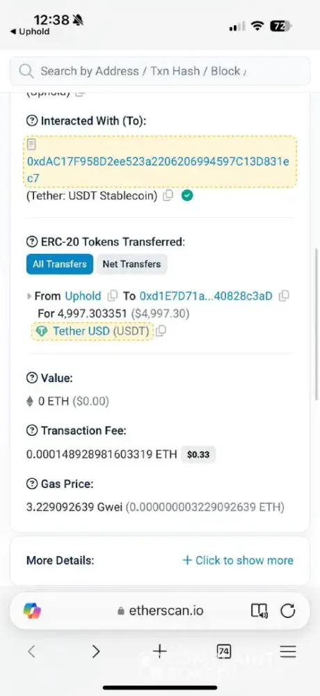wallet 0xdAC17F958D2ee523a2206206994597C13D831ec7 used app Ne UniverseMax to deceive me an transfer funds from my Uphold account.