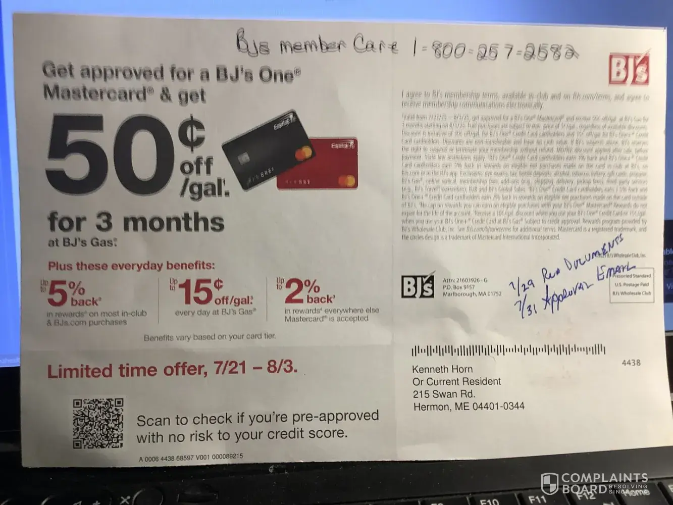 I received a promotion ad from BJ’s to apply for their credit card. It was: “get approved for a BJ’s one Mastercard and get 50 cents off per gallon for 3 months at BJ’s gasâ€. “Limited time offer, 7/21-8/3.†I used the QR code on the promotion piece and was taken to a website where I could apply for the card. I did the application and...