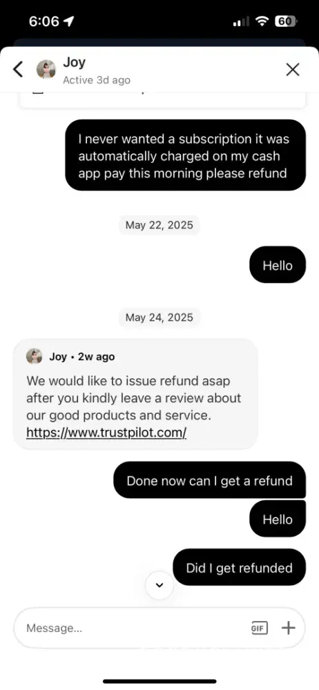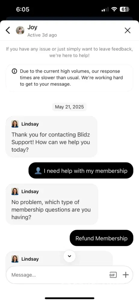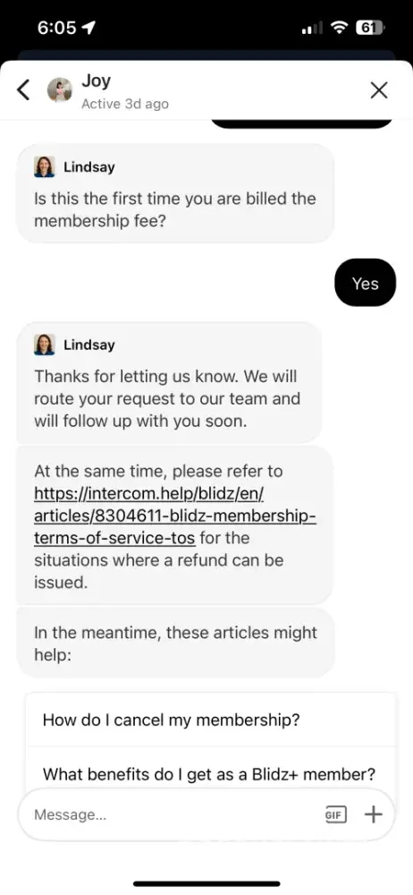 I downloaded the blidz app to see what all the fuss was about. I had to put a payment method on it so I used cashapp pay but when asked to start a membership I declined as soon as I unlocked my card and forgot they actually charged a membership fee. I have tried multiple times via app and email to get a refund talk to someone or get any assistance but I've...