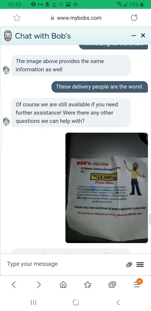 Delivery team states they were not asked/paid to remove the old bed. We had a very specific document stating otherwise, because the saleswoman at Bob's told us they would say that because it happens all of the time. (Perhaps fix the issues with your 3rd party vendors instead of working around them. "Hey customer, enjoy your conflict with the service provider we choose for you and you pay, because we don't like to communicate with them").