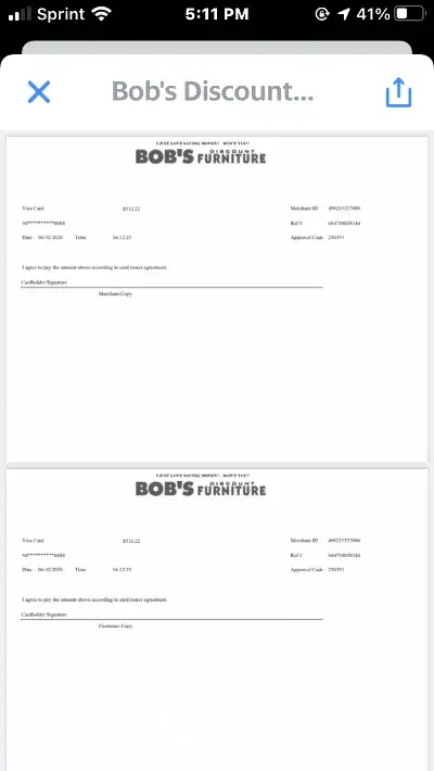 To date I have yet to receive any phone call or email from Bob's Furniture to resolve these issues. I have a damaged sofa set that I have not been able to use for over a year. I have lost five days of work from attempted service calls and time spent trying to contact Bob's Furniture. I am out $160.00 in dump fees from disposing of damaged parts that Bob's Furniture sent to my house.