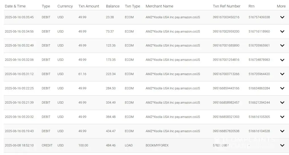 On June 16, 2025, over $400 CAD, was withdrawn from the card without the cardholder’s knowledge or authorization. These charges were made on AMZXsolla*, a merchant with whom we have no affiliation. Despite multiple emails to BookMyForex support, we have not received a case ID, confirmation of a dispute process, or any update on the status of this issue...