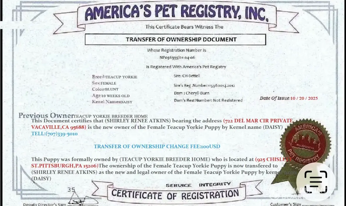 I purchased a TeaCup Yorkie for $600. October 20. Breeder name Teacup Yorkie Breeder Home. I was told from the breeder (John Femvi) Pennsylvania, PA that the puppy would be delivered on October 21. Then I get a email asking for 995 for asking me to send money through Apple Pay. Offering free shipping. Then I get a email from John saying he will email me the...