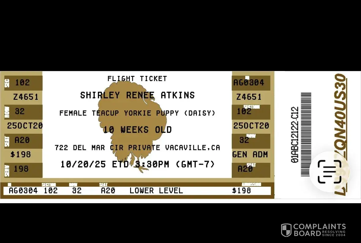I paid for the puppy and shipping, but of course, there was an issue with the shipping crate. They wanted more money from me, which was not part of the original agreement. I felt like I was being scammed and taken advantage of.