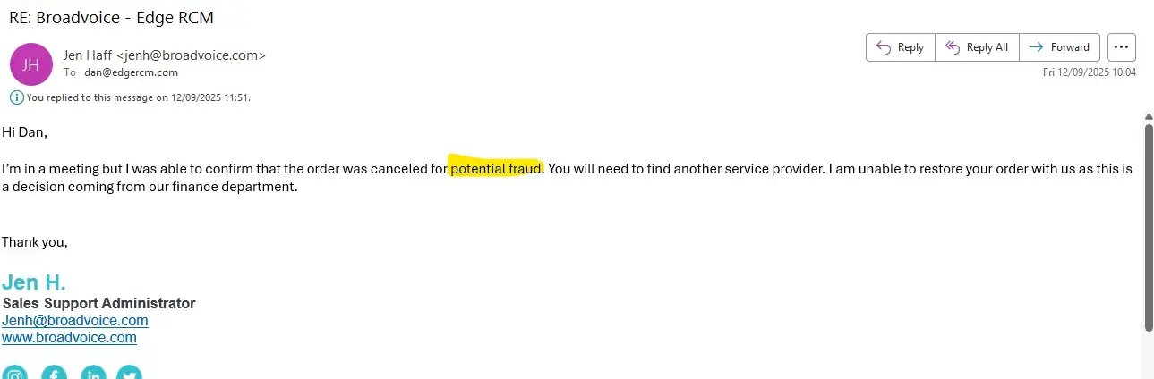 I applied for a Broadvoice business line and provided all requested documentation, including company details, billing information, and identification. Initially, Broadvoice asked for a business license, which I clarified was not required for my service-based company per the Maryland Secretary of State. After verifying this with the state and receiving a...