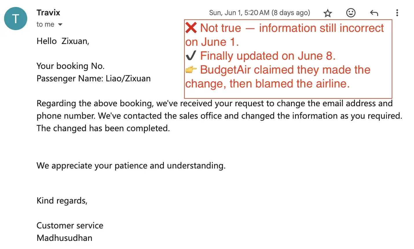 On June 1, they claimed the change had already been completed, which was not true — it wasn’t fixed until June 8. Meanwhile, they blamed the airline for delays, even though they admitted their own sales office was responsible for the change.