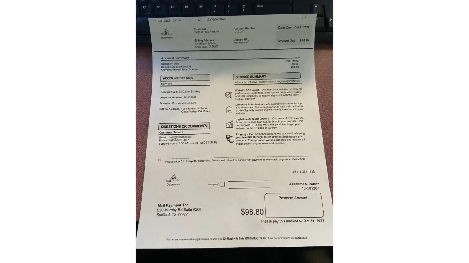 10/24/2022 9:35am PST We (KNCO radio station) received a fax from an unfamiliar company we don't recall purchasing any recent charges from. They are called "delta seo" Deltaseo.co When typing in the company name, different companies pop up. If you type in the link, it says 'page not found' If you look up the address the invoice provided to send the bill...