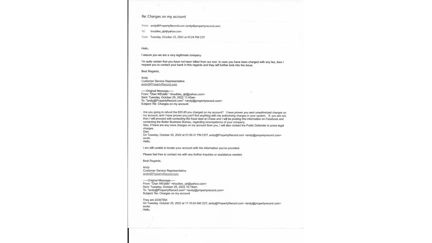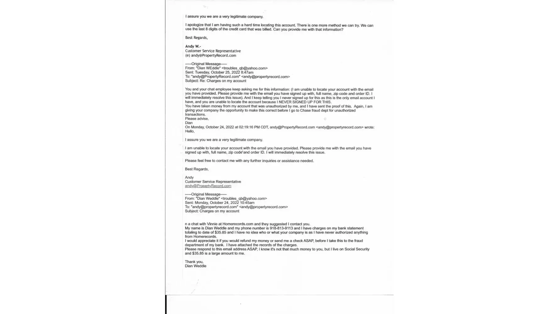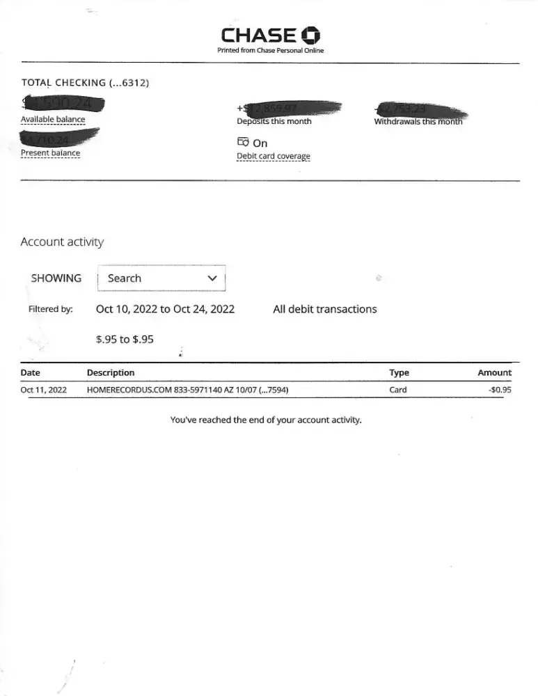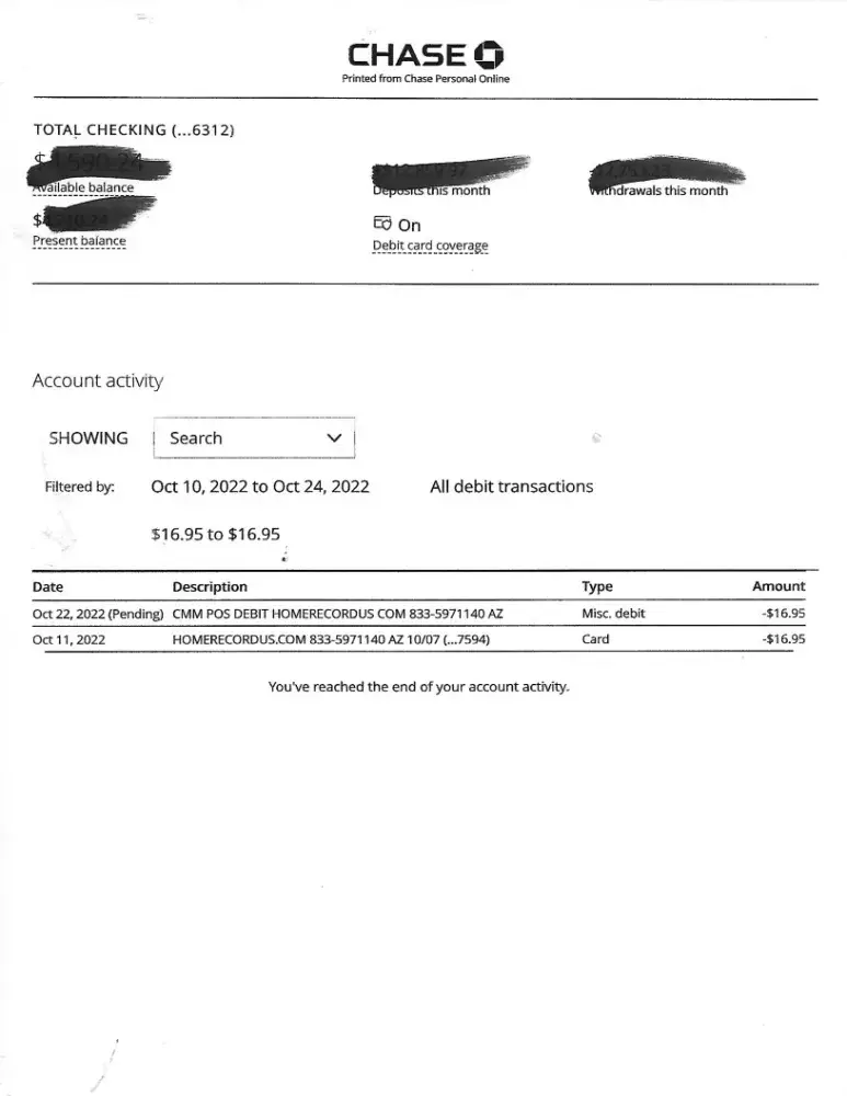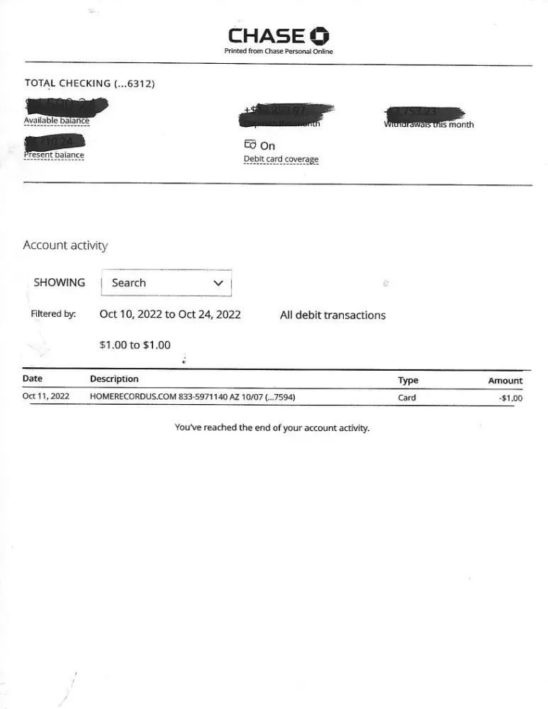 There are 4 charges on my bank account through my debit card from a company called Homerecords.com from AZ. for a total of $35.85. I contacted the company the first time on 10/24/22 through a chat requesting verification of what this was for, they suggested I contact someone through email and gave me the address, because he could not locate an account for...