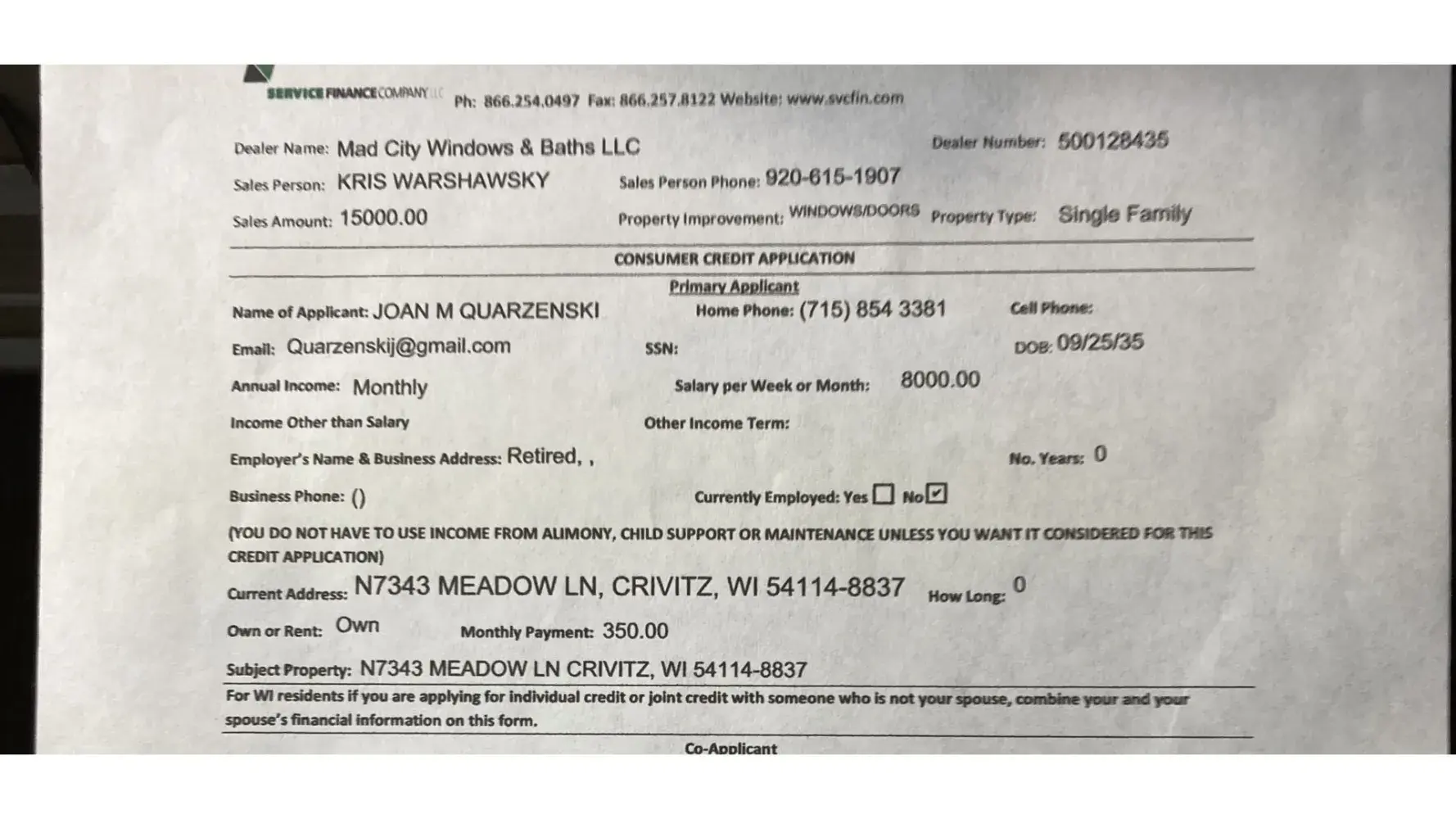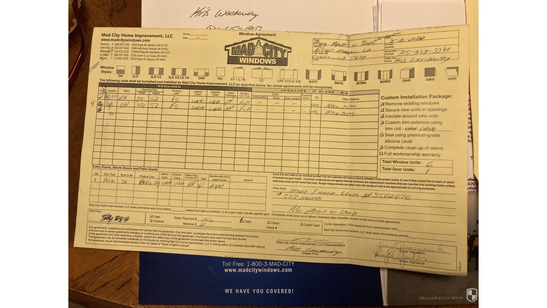 Mad City salesman Kris Warshawsky took all my mom and my numbers for the credit report and made this great big spiel about having windows and doors and bathroom in. I had told Kris that we don’t want to up in price because we are on a fixed income. Kris gave us the figure of, I wasn’t sure because he scribbled out one price and wrote over it with what...