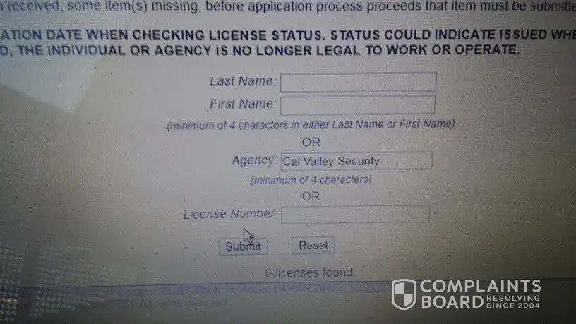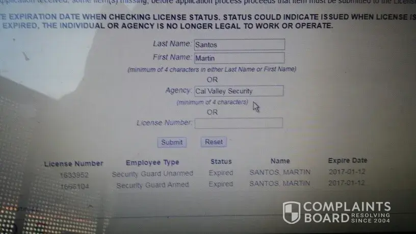 The resident manager appears not to be licensed as well this pic is from az dps website I guess cal valley security as a special way of using their name but martin santos the resident manager is not licensed