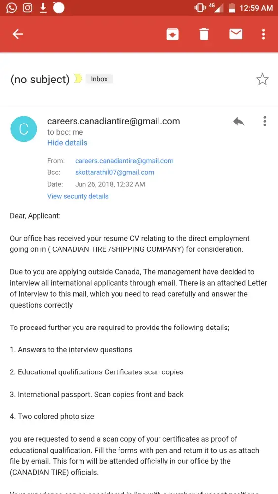Hi... My name is shihab. Iam writing this from India. I have applied for a job through shine app. After two days I got a mail and in there they mentioned some details. I will add the screenshot of that mail. Please check it and confirm.