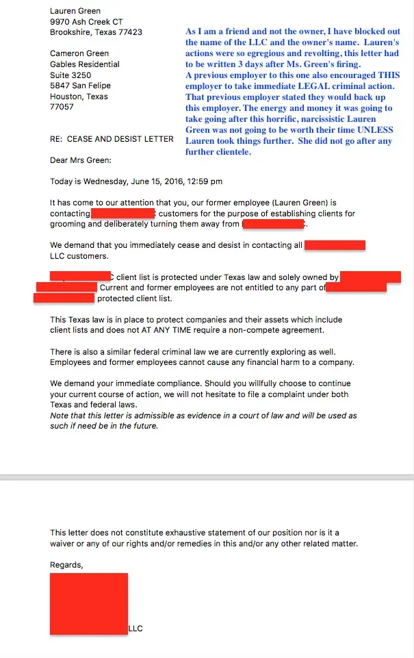 And her several employers (that all have spoken with one another and compared notes). They came to realize just how horrible of a human being Lauren Green is and how many lies she told in various places of employment. Not just lies but possible criminal behavior. Since much of the behavior could be hard to prove, all the employers chose not to go after Lauren Green.