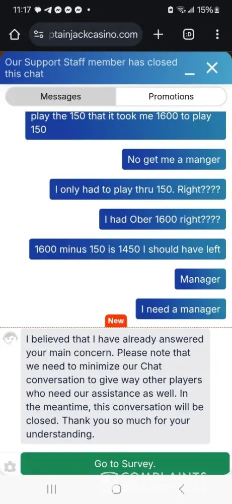 I made a deposit on September 24 at Captain Jack casino i I got a no rules bonus. I won and I wanted to withdraw $850 of my winnings I do know that they take any bonus that you receive out of your winnings which is fine but it's been 18 days and I've been lied to repeatedly about my withdrawal I've done everything they have ask asked it states in their terms and conditions that all withdrawals will be Approved within seven days again it's been 18 days and nothing has been done I've spoken to them on numerous occasions I have screenshots of all my conversations can you help me resolve this issue