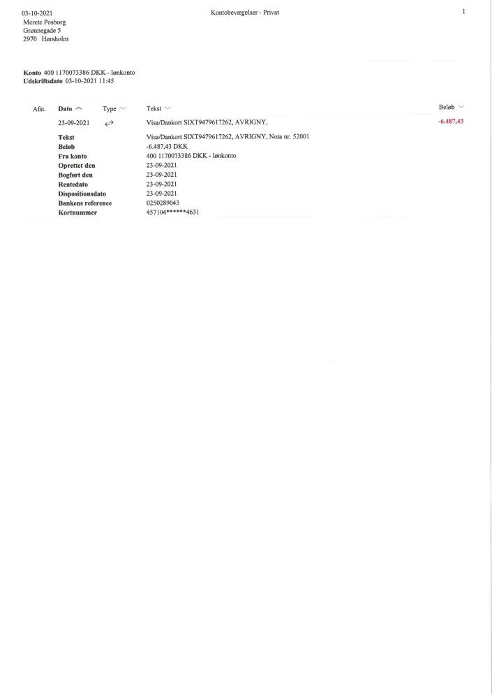 Payment to Sixt 23.09.2021 DKK 6.487, 43 - enclosed.