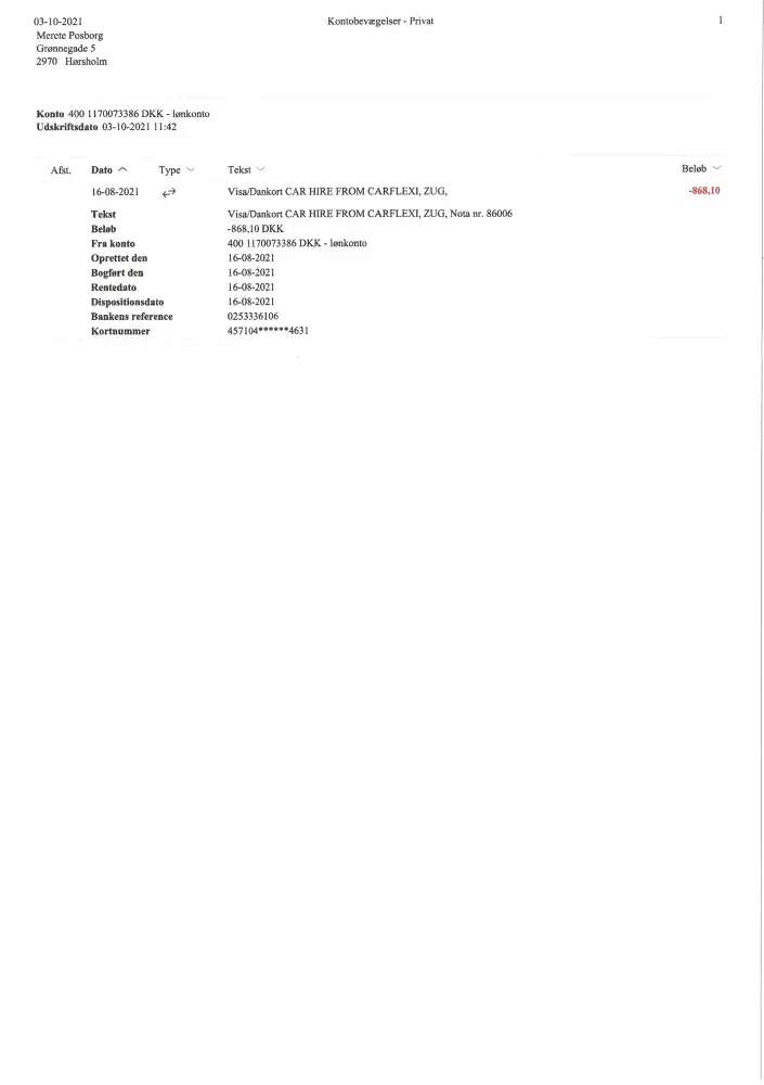 Prepayment to Car Flexi DKK 868, 10 - enclosed.