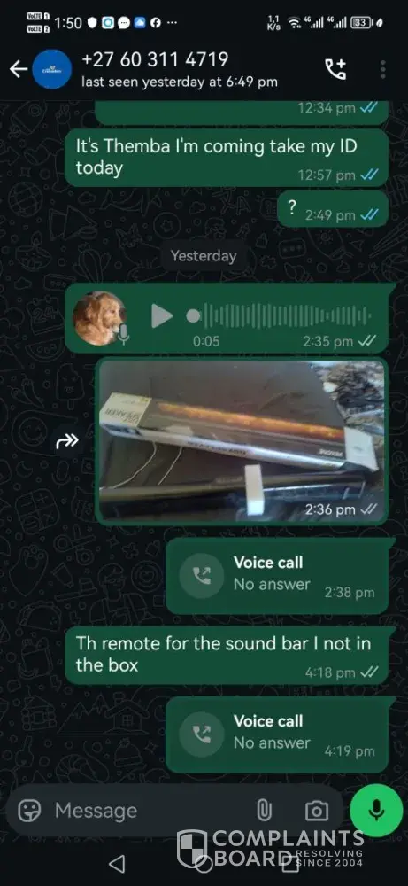 I'm themba pandelani id 8305235673089. Two weeks back. Went to jabulani mall branch to pawn my soundbar.In a box with remote and charger forr350.00. On the 01 july I paid back The r350.00. I took the soundbar home. On arrival. I checked the content of the box. It was just the soundbar no charge and remote. I called the store. They ignored my text and calls on whatsapp.