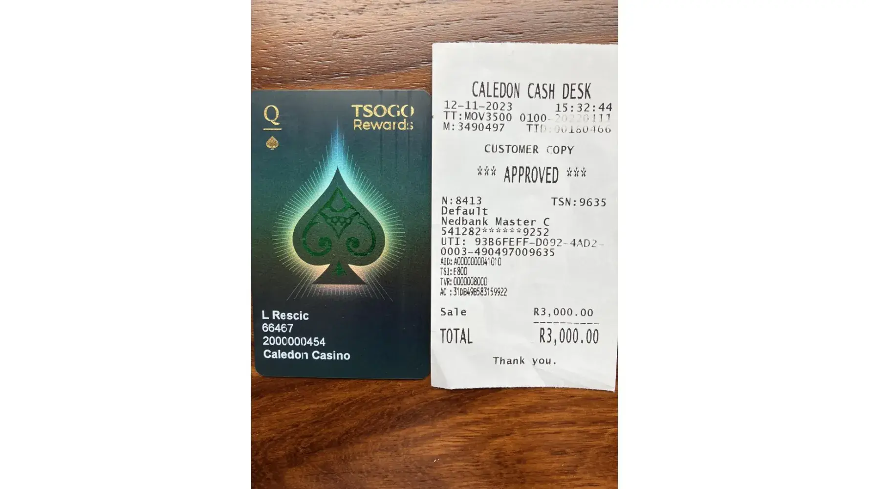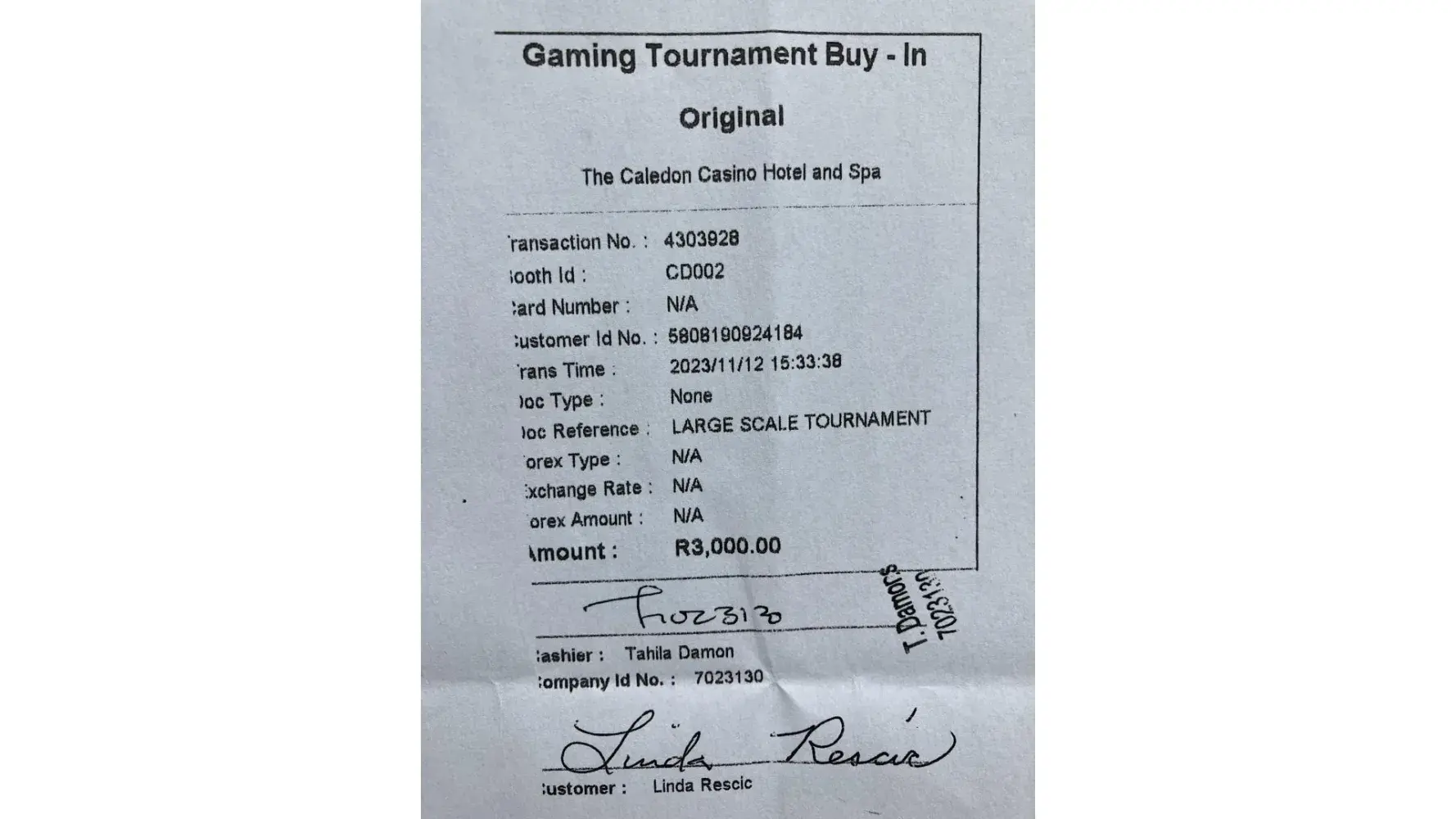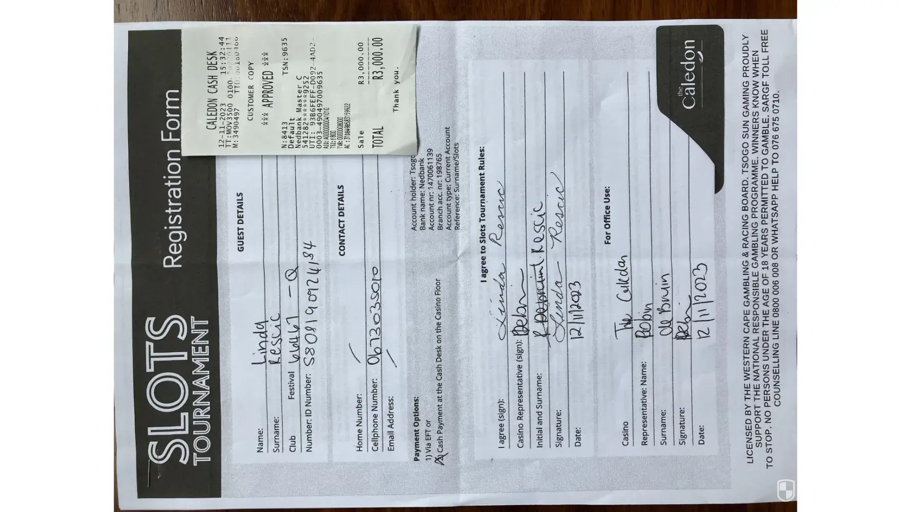 On 12/11/2023 I was approached, in the Caledon Casino, by a Casino employee, Robin de Bruin. She came and asked if I would like to participate in the Slots Tournament which would take place on 8 and 9 December 2023. I asked her twice, just to confirm her response, what the R3000 package included. Ms. Robin de Bruin stated that the R3000 included the...