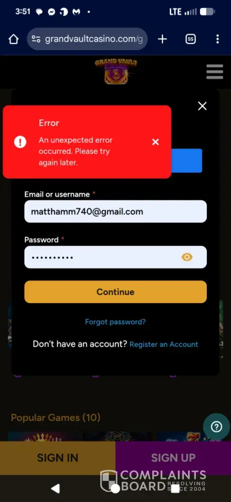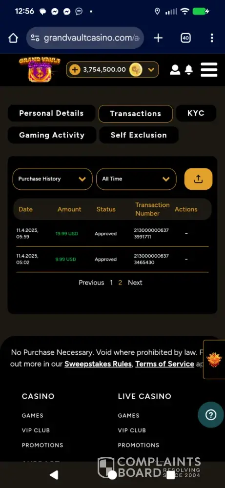 I became a registered user at the Grand Vault Casino on [protected], which operates as a sweeps casino. I purchased one of their Gold Coin Packages which provides the player with a large amount of gold coins, which can be used for recreational play only. The gold coins are basically worthless as they cannot be redeemed and have no monetary value, for someone...
