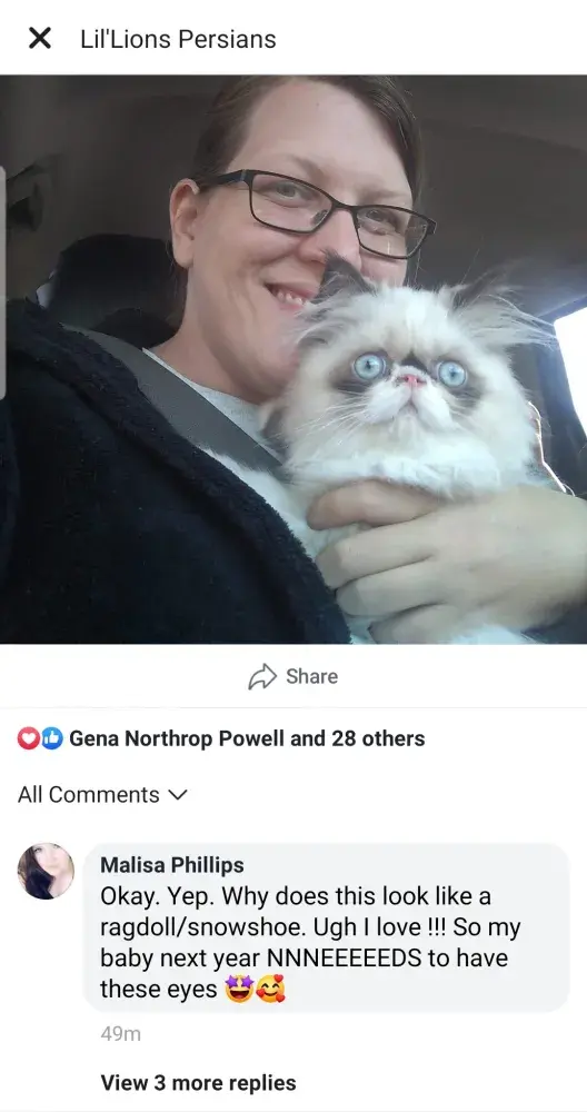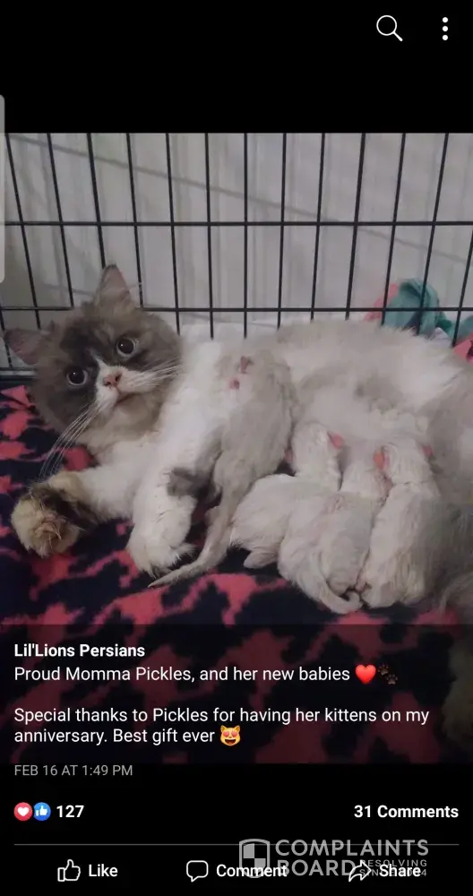 Everyone looking 2 get a purebred persian kitten. beware of people from alabama, mississippi, wisconsin, n louisiana. mixed bred. jessica lovett couch of lil lion persians. she's a very deceiving woman. if you or anyone you know bought a cat from her. look at this. she had 1 ragdoll bred 1 long haired cat. called 1 of the kittens pickles then bred a half...