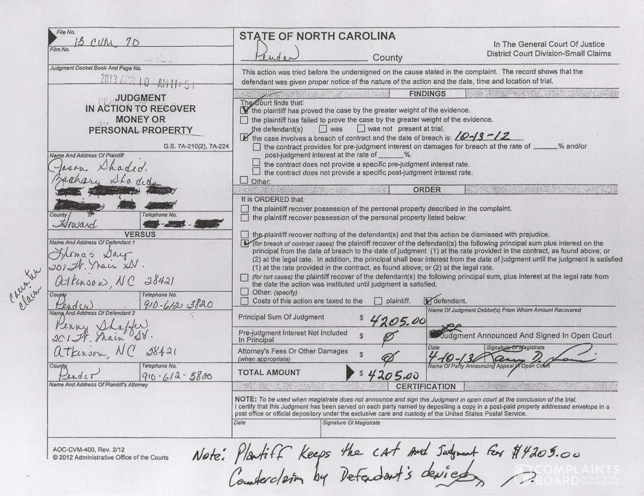 I am posting this complaint to caution anyone who is considering buying a kitten from Penny's Persians (http://www.pennyspersians.com) of Atkinson, North Carolina, owned and operated by Thomas Gay and Penny Shaffer (the breeders). In April 2013, I successfully sued Mr. Gay and Ms. Shaffer in North Carolina Small Claims Court for breach of contract. The...