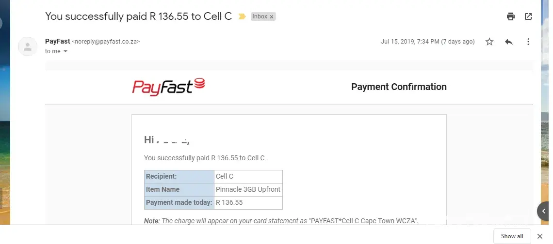 Attached proof of order details online and the PayFast payment confirmation.