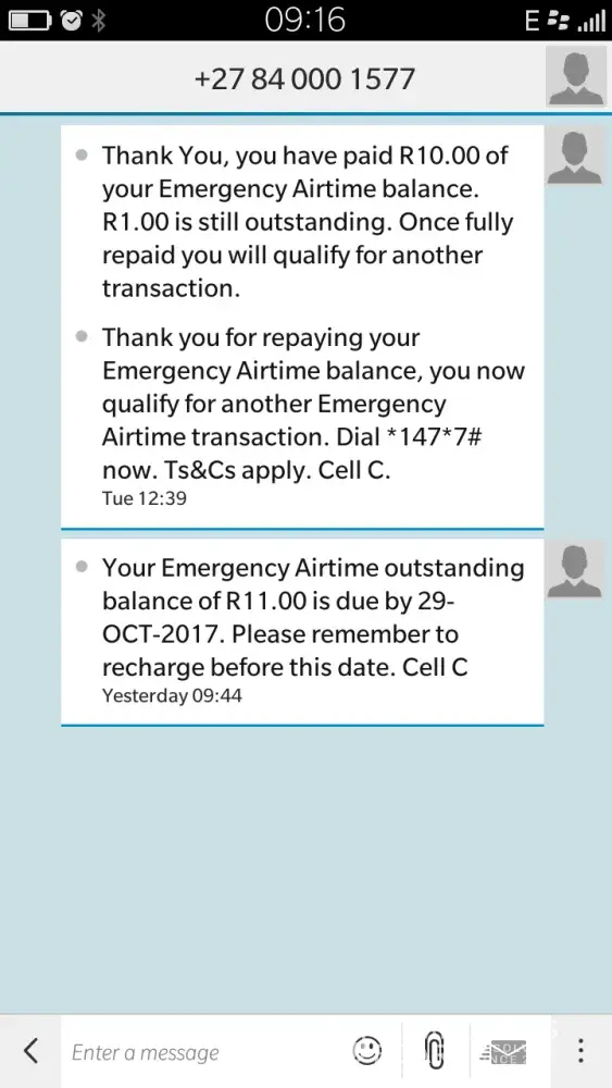 I'm not happy at all with this network, I bought air time on the 24/10/17 you took the amount that I'm owing you then I left with cents I recharge again on 25/10/2017 you send sms that I'm owing --Your Emergency Airtime outstanding balance of R11.00 is due by 29-OCT-2017. Please remember to recharge before this date. Cell C, then I'm su prise. who borrow that amount and when and it's very painful to work with people like you, it's not for the first time you did this to me I think it's X3 now one day I call customer service the lady she didn't give me satisfied answer but the way you do guys it's a fraud I can take this further to right institutions