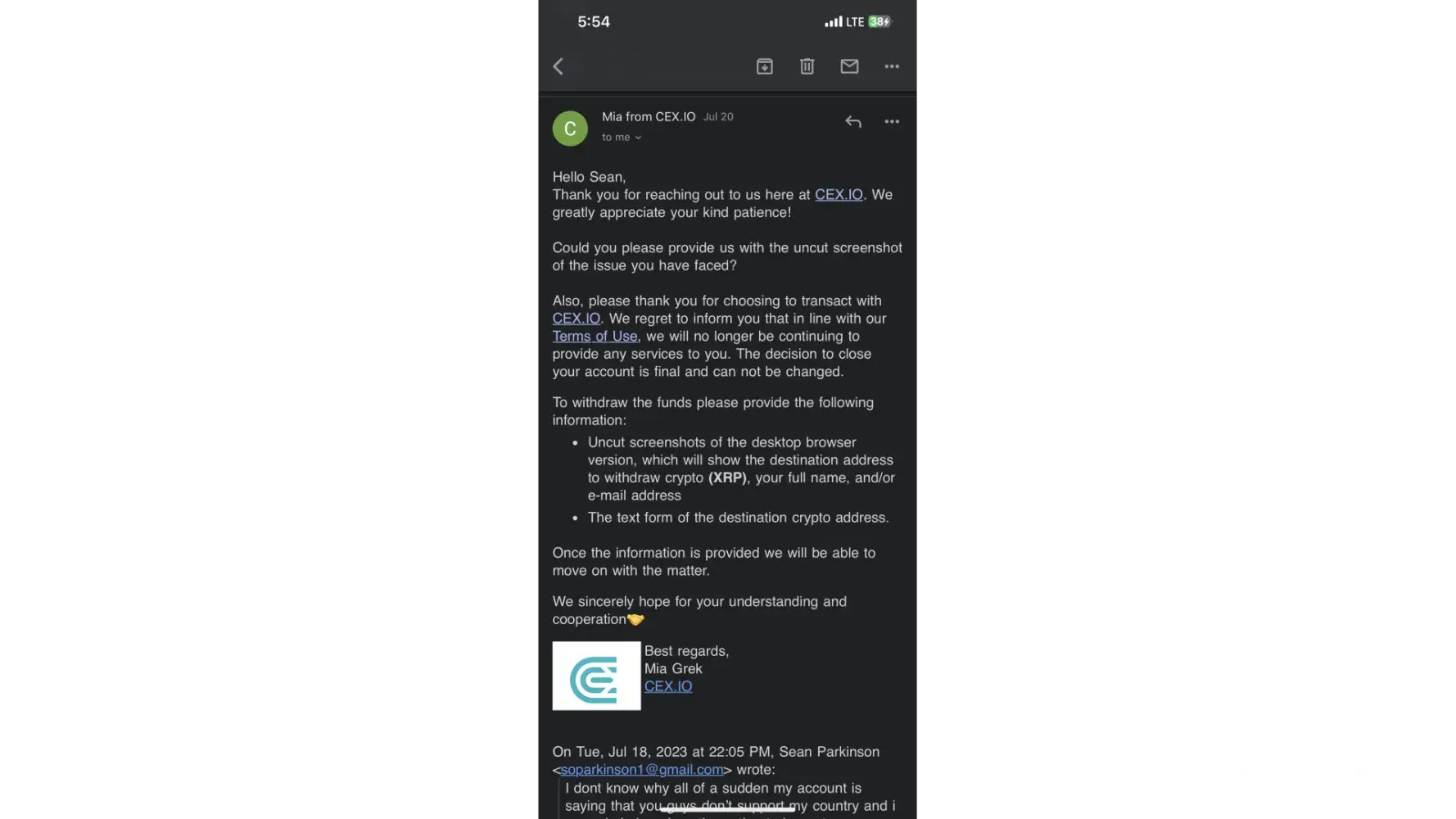 Here is my last email message to cex.io, which is still unanswered: