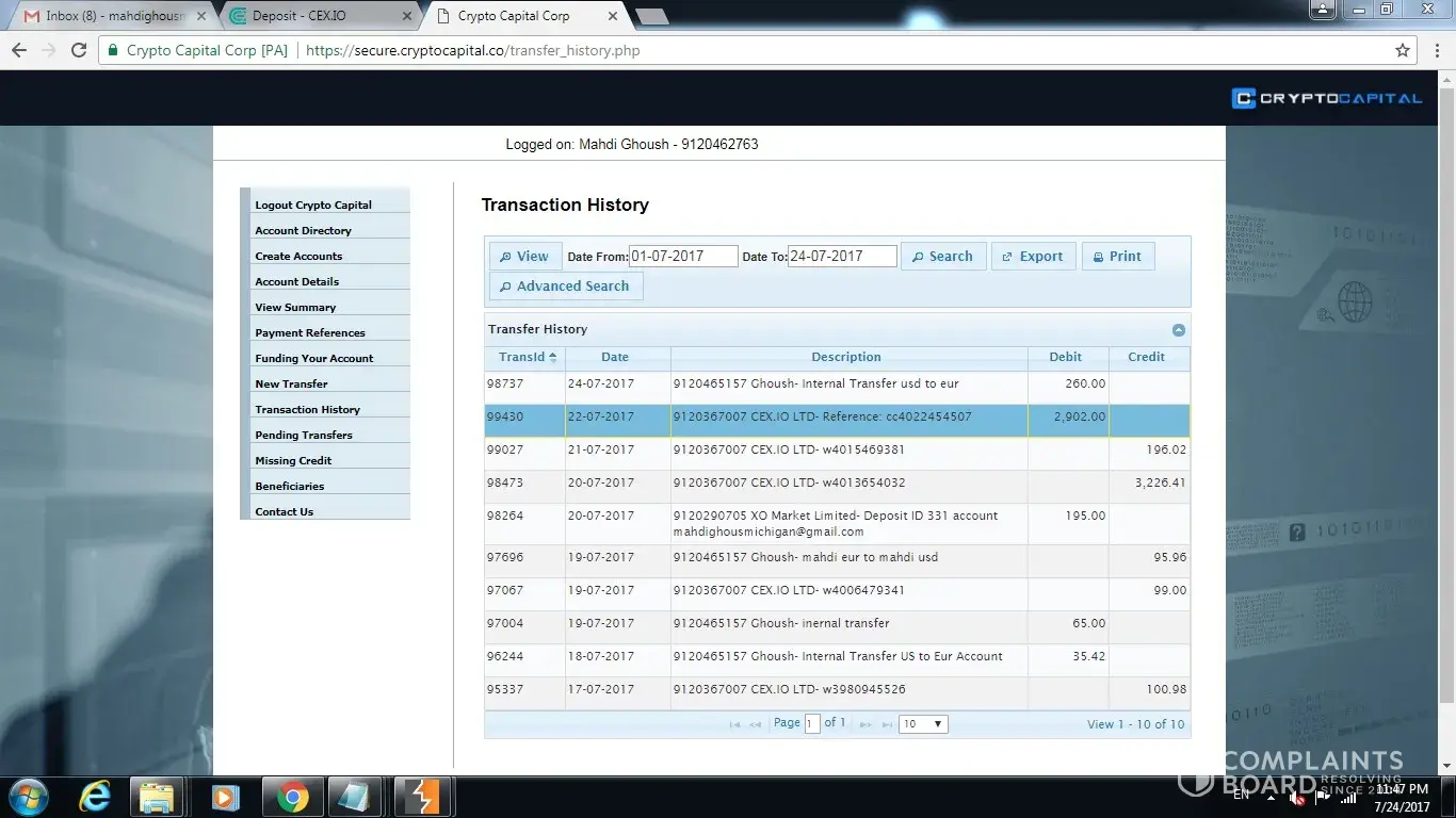 i made deposit via creptocapital for Amount $ 2902 and it is processed by Crypto Capital on 22-07-2017