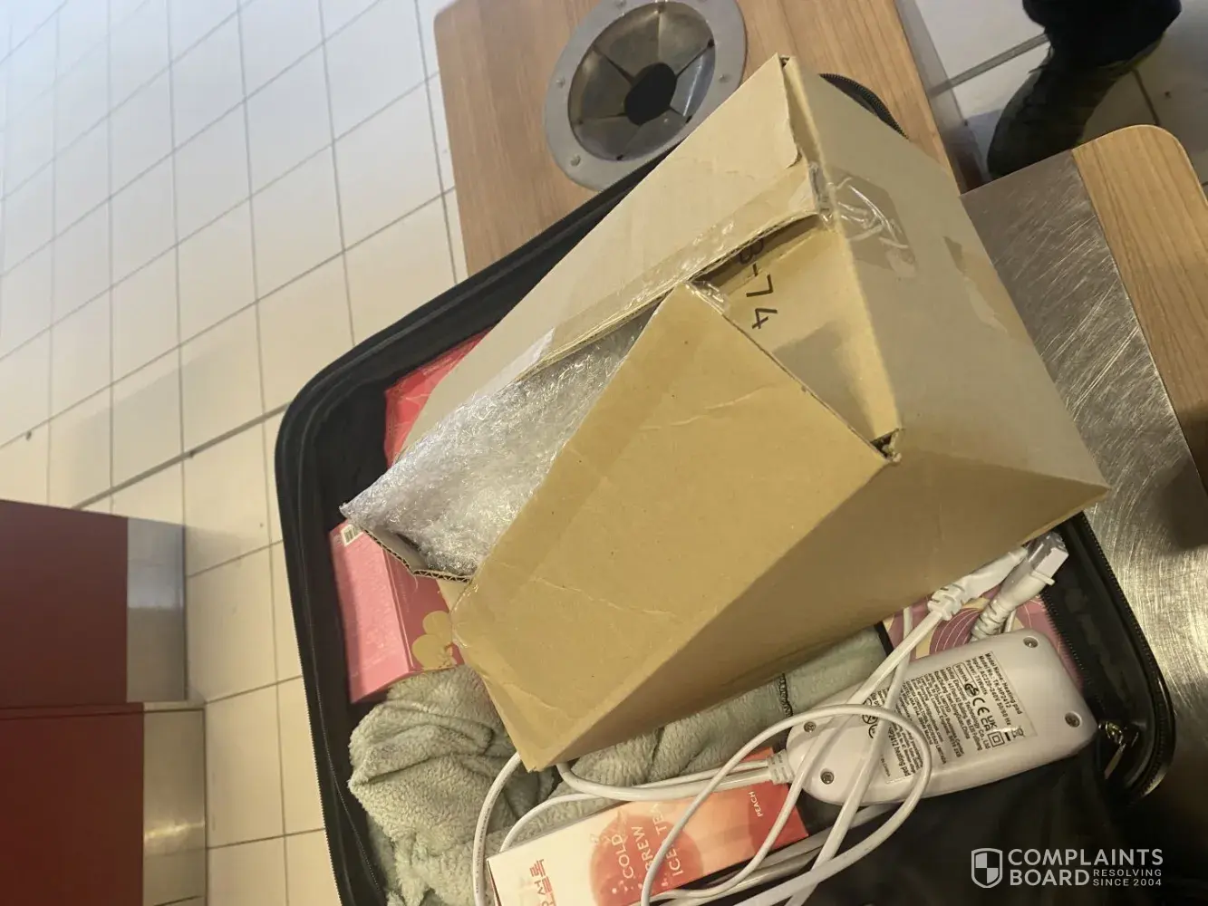 During Security screening i had forfotten jam in my luggage and my bag had to be checked seperatly. During that the Security person ripped apart a Package i had inside and damaged a paper lamp.