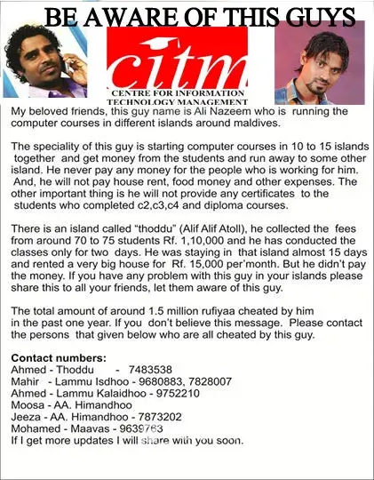 Naseem stayed in that island for couple of weeks telling that he came to conduct an exam for the students those who have completed the Certificate level of an ICT course. I checked the syllabus of the Certificate course and the Diploma level. It was all about the fundamental stuff. You can't call it a certificate or a diploma level course. it's all ###.Funny thing is, he gave them an exam and told the students that if you can get through this u can join the diploma level. Even a three year old can answer and design the stuff that he asked the students to do.