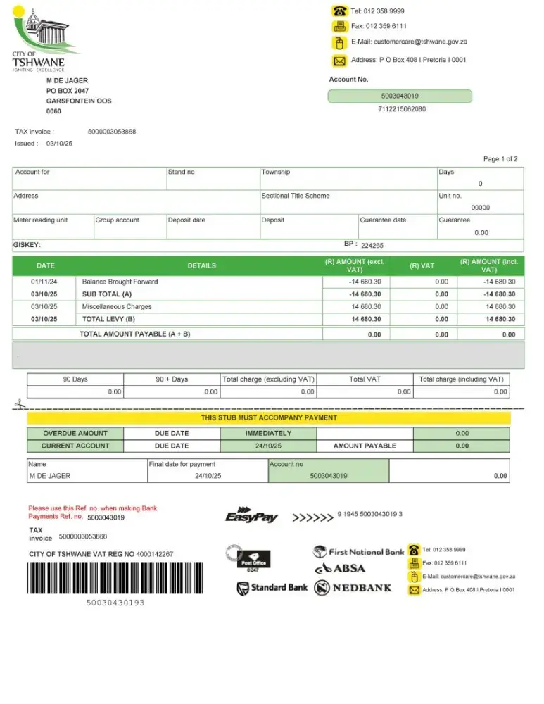Wow where to start... We moved into our property in September 2022, Tshwane issued us with an account of R6000 when we weren't event moved into the property yet. Complaint lodged, no response. Had a water leak outside our house at the water meter (which is Tshwane's property), reported the leak, was assured we won't pay as Tshwane is liable, yet again issued with a R14 000.00 account, sent numerous email, lodged complaints, went to city council, nothing! Received a letter of demand though...so Tshwane can do that very fast.