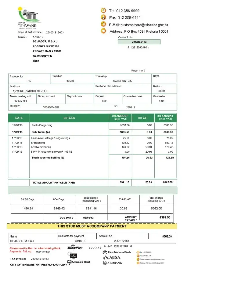 I have sent this information to various people at Tshwane, and also explained this numerous times to the company appointed to recoup the "outstanding" amount. 1. I owned the property located at 728 Nieuwhout Street (Stand 546, unit S0001) up to 2014. Please see an old account for your information attached “1-Old statement.jpgâ€, with my account number...