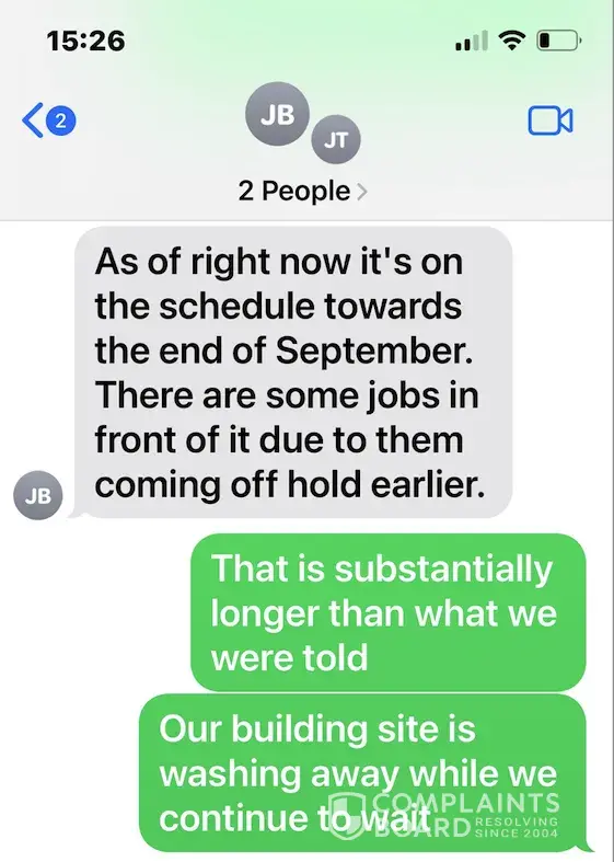Upon being notified of this situation we immediately contacted the client. It is a top priority to address their concerns. In our conversation it was determined the manager did not tell them we would pull the crew off of their job if they complained. The accusation about the crew sitting in their truck was brought to the customer from another contractor working on the site, and was not witnessed by the customer. The accusations have been brought to the attention of the local, and regional management and it was discussed that this did not occur unless it was a lunch break, or otherwise. The down payment was made on October 4th with a tentative erection date of December/January per the contract. This winter has been unseasonably warm at times, and has also been unusually windy as well. This certainly has impacted the start and completion of the project as any type of winter weather will do. We started this project on February 7th, seven days past the “tentative” date provided in the contract. There is replacement steel, for material damaged by the storm, delivering the week of March 13th, and we will be proceeding with the two days of work to complete the project during that week. We continue to work with this client to provide them with a quality building, and will address any future concerns promptly as we have done in this case.