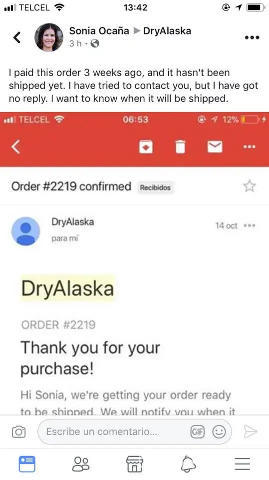 I made an online order on dryalaska.com on 10/14. My order was #2219, and it cost 300 US dollars. It was the "Stinger long coat": https://dryalaska.com/collections/womens-parkas/products/stinger-long-coat I got an email saying that my order was confirmed, but I never got feedback after that. I emailed them (to their gmail account, the only one they...
