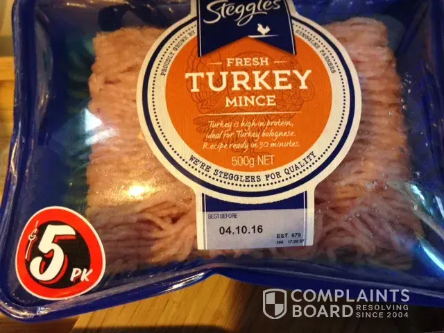 On Sunday 25th September we bought multiple meat products and transported them to our fridge within 15 minutes. They have been in the fridge together (as you can see by the picture), however, the Steggles Turkey mince - 3x packets - have expanded as if they have been out of the fridge.