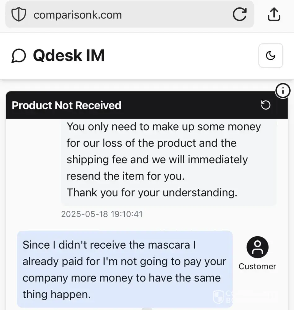 ComparisonK.com has received 1 complaints on ComplaintsBoard. The first reported case, Mascara order that I never received , was published on May 18, 2025, and the most recent complaint, Mascara order that I never received , was posted on May 18, 2025.