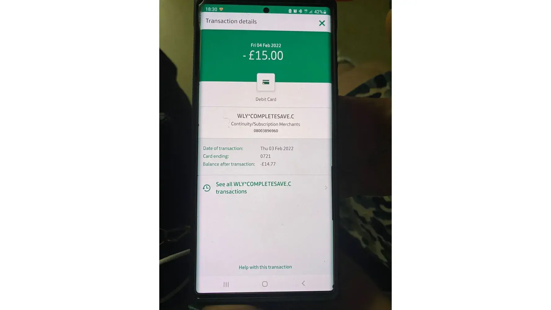 WLY Complete savings has debited my forex card illegally. The transaction was unauthorised and random. They debited 15 pounds to my account. I never enrolled for any services. I want to take action on them. Kindly advice the best step for the same. The debit happened on the 6th Feb 2022. I had never applied, subscribe or knew about this services before this debit happened.