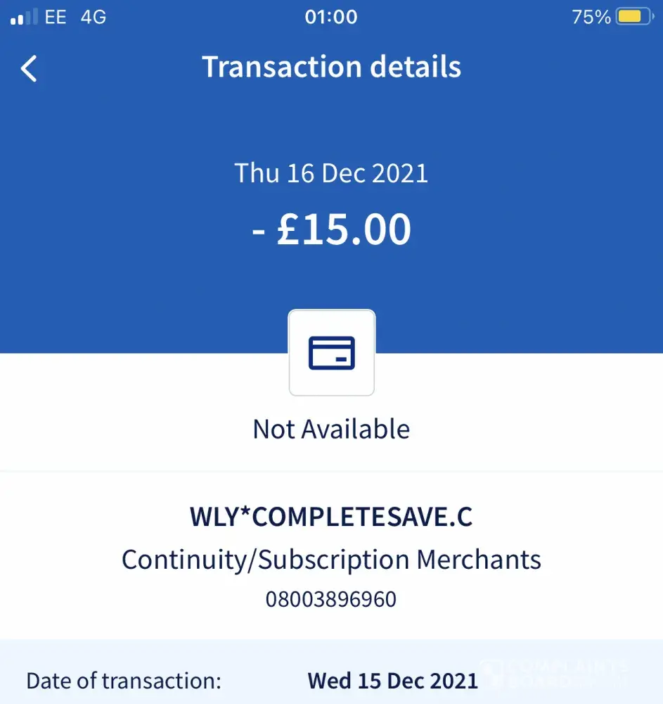Just this morning 19th December 2021, I went to order a Christmas card for my sister but my card was declined due to not having enough money. I thought this was strange because I put £20 in my account yesterday 18th December 2021, so I went to check my banking app. I looked on my recent out payments and it said a company called complete save had taken £15. I have never in my life heard of this company let alone subscribed to it because I'm only 16. I worked hard for this money and did not appreciate it being taken from my account for something I did not buy and need it back soon if I am going to be able to order the things so they come in time for Christmas. I would like a refund.