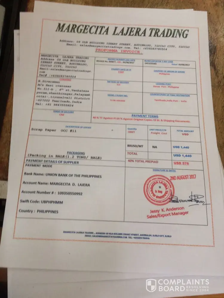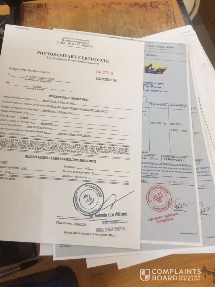 We have agreed and I margecita lajera trading company in philipines to deal paper container 20 feet at $ 4, 680 I paid them $ 1404 in advance On the basis that the remaining amount is paid 3278 after he sends us pictures of b / l properly and after to make sure the goods Surprise then that he wanted to send him the rest of the money has sent us picture...