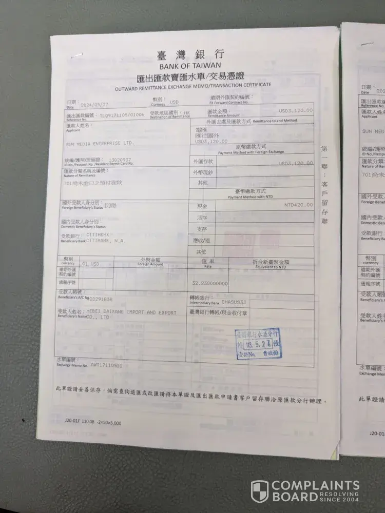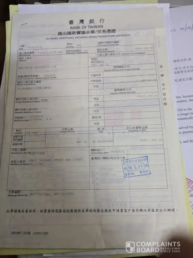 I sent deposit of USD4680 to purchase on 2 occassions USD3120 and usd1560 TOTAL USD4680. USD3120 was to Place and order and USD1560 when goods are ready for loading. But supplier scammed me. send me fake shipping delivery order and asked for balance payment USD10,920.00. When i refused reason as per contract they suppose to ship the goods and send me...