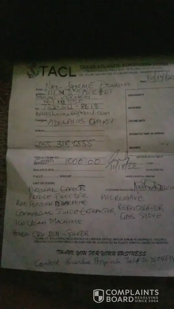 Read full complaintTrans Atlantic Container Lines - Freight service shipment to Ghana