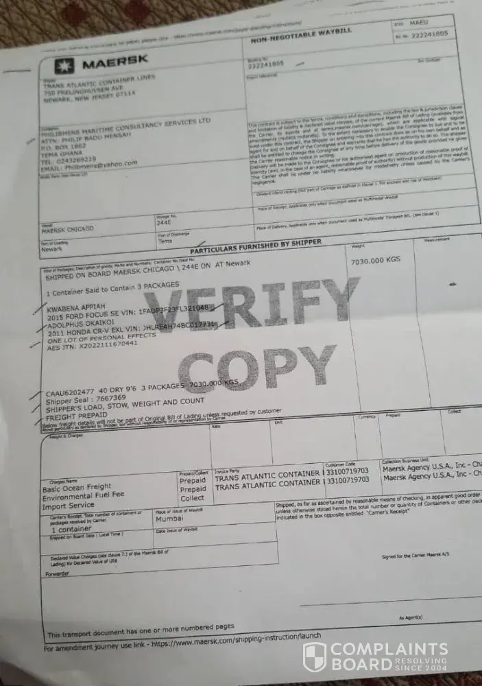 On 10/14/2022, I engaged the services of Trans Atlantic Container Lines to ship a car and personal effects to Ghana. The CEO of the company personally told me the price for the shipment in the presence of a witness would be between Two Thousand Five Hundred to Three Thousand Dollars. He advised me against renting a 20-footer container, instead he suggested...