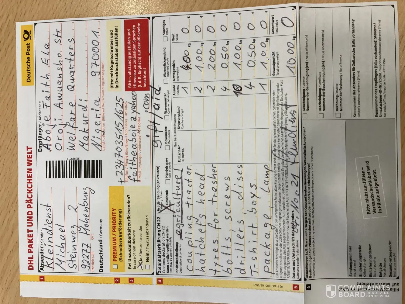 Sent a parcel again to nigeria, again big problems with nigeria customs! Parcel 10 kg, sent 4th nov, today 6th dec confronted with a ridiculous bill/duty of 64000 ngn. Parcel is a gift, documented, value 0 to a female farmer to help her. parcel has agriculture parts (a coupling for trailor/tractor, 2 drillers and 4 screes to install, 2 small wheels, 2...