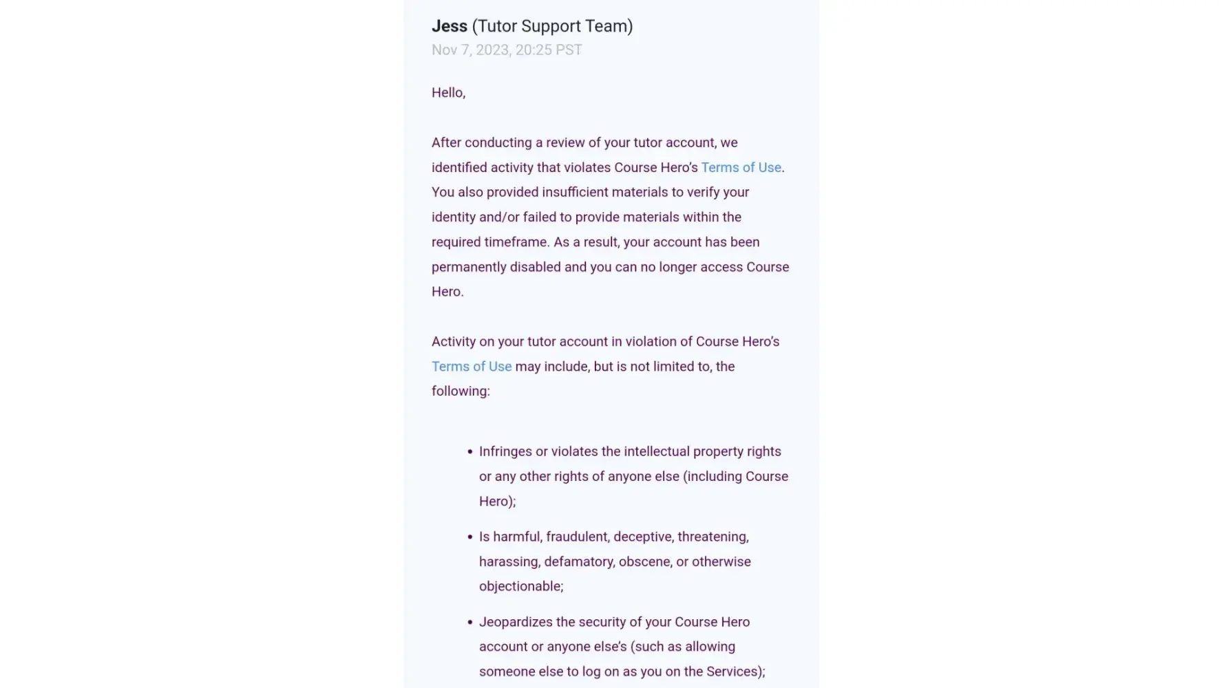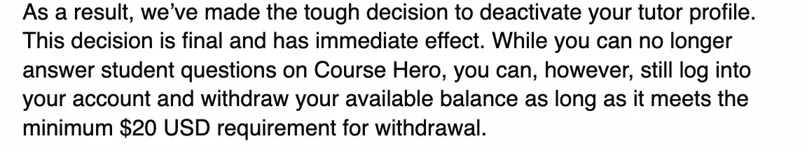 "After conducting a review of your tutor account, we identified activity that violates Course Hero’s Terms of Service." You also provided insufficient materials to verify your identity and/or failed to provide materials within the required timeframe. As a result, your account has been permanently disabled, and you can no longer access Course Hero."