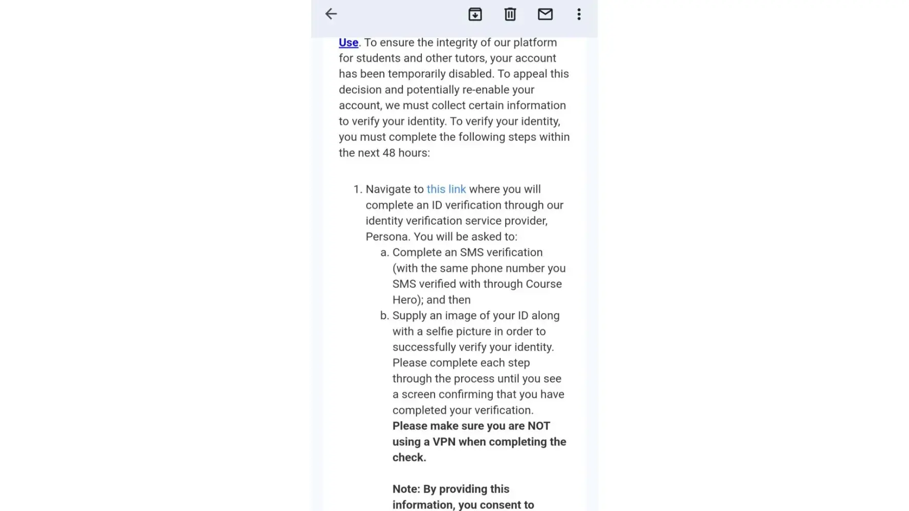 CourseHero unfairly disabled my account without any valid reason or explanation about why they did it.I received an email telling me that my tutor account has been temporarily disabled because, according to them, they have identified unusual activity on your Course Hero tutor account that violates our terms of use.They gave the link for verification but the link showed expired.How can i prove my identity with an expired link? I have e mailed tutor support team over and over, but they didn't give valid link, How can i fill in information with a expired link? Even on their website, they mentioned that "if there any issue during identity verification, please contact the tutor support team", what is the meaning of that? They don't help tutors. I even call for course hero company, but they told me to contact the tutor support team, but tutor support team is not responded to my issue. I have never use VPN, and never shared my account with anyone else. Therefore, what is the meaning of breaking the terms of violation? Please be responsible. Please provide a valid link.