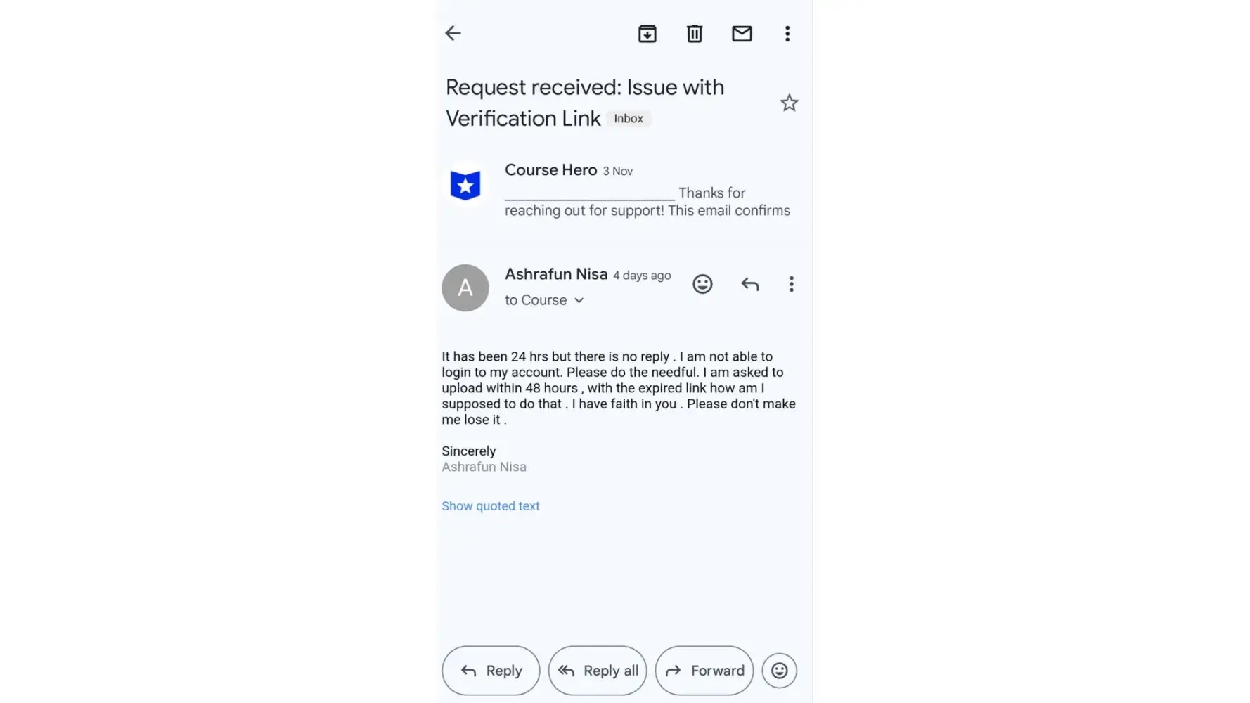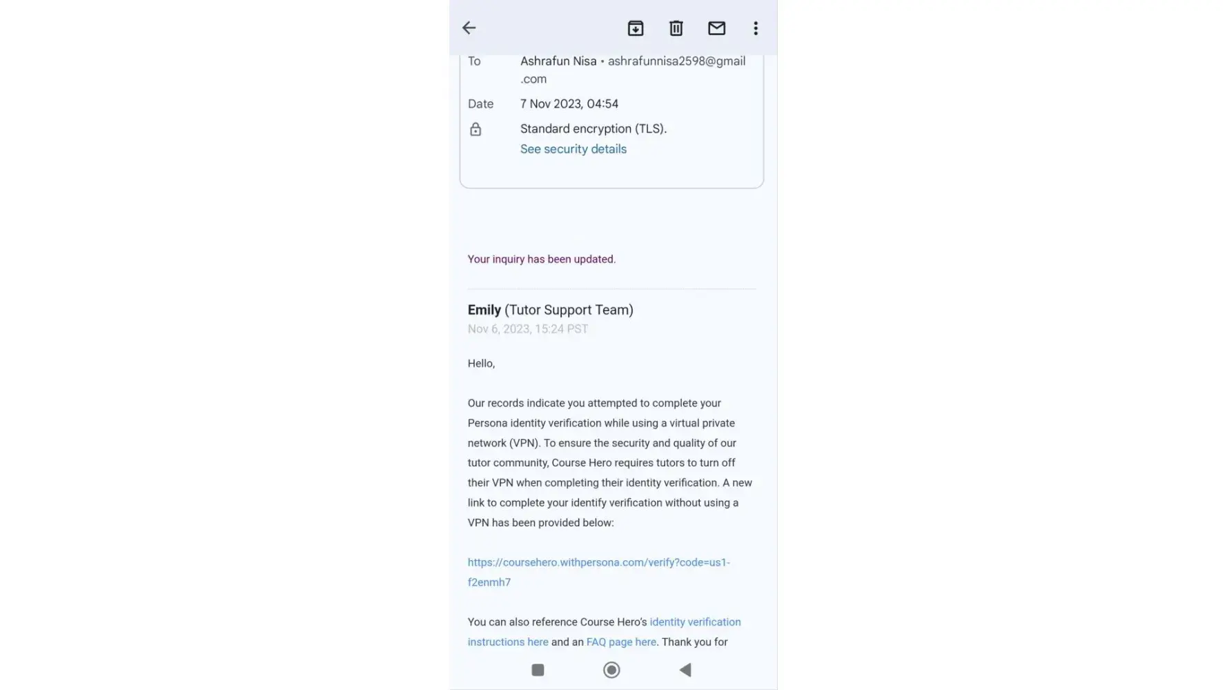 I am Ashrafun Nisa who works as tutor on course hero. I received an email on Nov 3rd that my account is temporarily disabled due to unusual activity which I am completely unaware of & was asked to re-verify my account on given persona link which was already expired on Nov 3rd . I got a new persona link after complaining for 5 days on Nov 7th & I successfully completed the verification process on Nov 7th at 5 am IST .