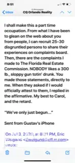 My name is Gustav Rosenbach. On June 22 I met with the proprietor (so he claimed), one Eric Weigand. We were meeting to discuss the possible sale of 2801 Lake Arnold Pl., in Orlando, Florida. Upon first encountering Mr. Weigand, his appearance was somewhat disheveled, and there was a perceptible odor of alcohol on his breath. This alone made my wife and myself, quite uneasy. While discussing financial amenities, Mr. Weigand interjected that the crime rate was extremely low, due to the "absence of [censored]s and Cubans." Now fully alarmed, my wife urged me to immediately break off the showing. Which, I immediately did. Having dealt previously in Real Estate, I decided to ask around, and was somewhat taken aback at what I discovered . Mr. Weigand is apparently the subject of an investigation by The Florida Real Estate Commission as regards numerous and repeated code violations on the properties he manages. Additionally, a female tenant has claimed that Mr. Weigand threatened her husband with a pistol, for late payment of rent. Until this investigation is complete and duly referred to the proper police athorities in Florida, I would urge anyone with a sense of urgency to stay FAR away from CQ Orlando Reality, Inc.