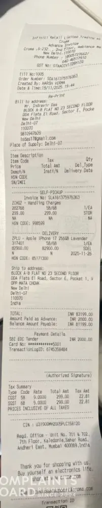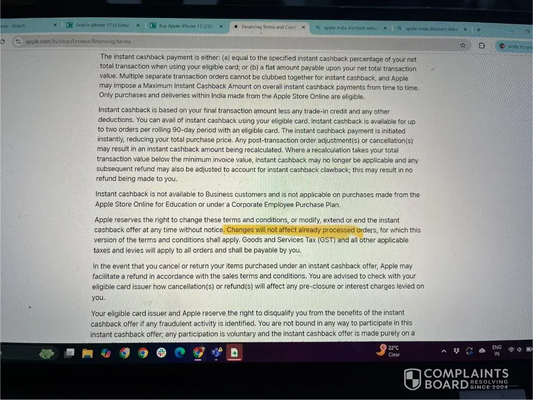 I booked the iPhone 17 through Croma's Vasant Kunj. New Delhi store (Ambience mall) on 19th Nov 2025 with a pre-booking amount of Rs.2,000 with the assurance that once the device arrives in-store, I will receive an instant cashback of Rs.6,000 through ICICI bank card. On 22nd November, Apple announced that they will be reducing the discount amount for phones ordered through their website post 22nd November (Source of news: https://www.moneycontrol.com/news/business/indian-buyers-hit-as-apple-slashes-iphone-17-cashback-offer-amid-major-supply-crunch-in-india-13690676.html)